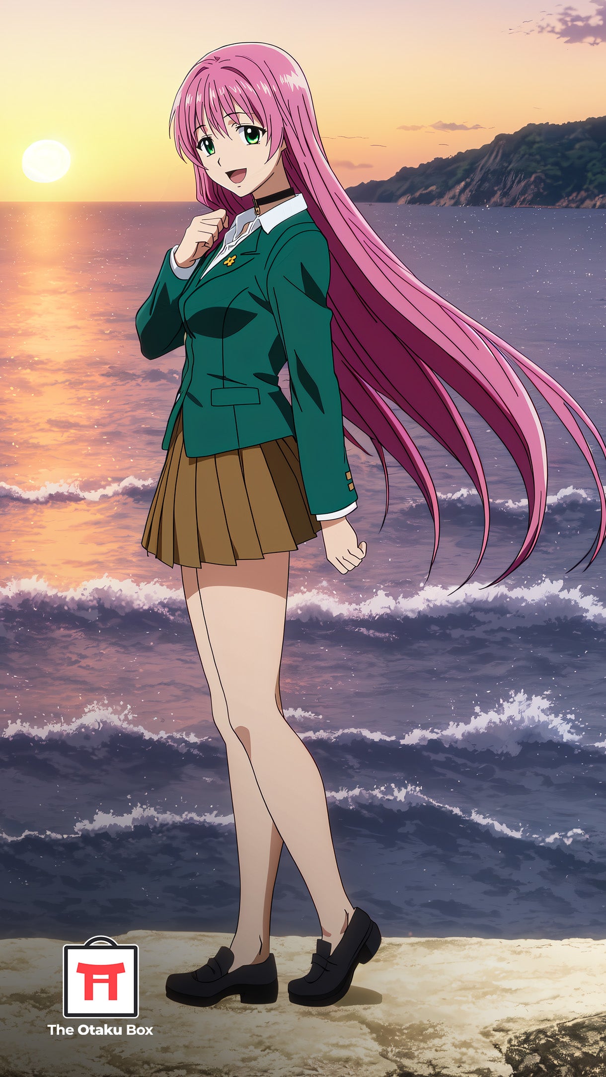 Outer Moka has long pink hair and vibrant green eyes. She wears the standard Yokai Academy school uniform, which consists of a green blazer, white shirt, and plaid skirt. Her soft features and kind demeanor reflect her compassionate personality, making her approachable and endearing to others.